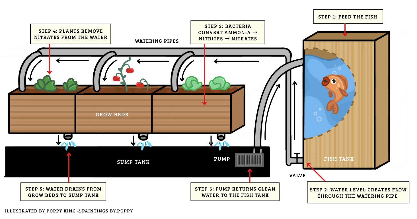 Aquaponics is a closed-loop system that combines aquaculture (raising fish) and hydroponics (growing plants without soil) in a symbiotic environment. The key player of aquaponics is naturally occurring bacteria that are responsible for converting nitrogenous waste produced by fish into readily available nutrients that can then be absorbed by plants. The plants, rooted in a soil-free medium such as clay aggregates, filter and clean the water, which recirculates to to the fish tank creating a self-sustaining, water-efficient ecosystem. This efficient integration of biological processes makes aquaponics an environmentally friendly and scalable solution for sustainable food production.